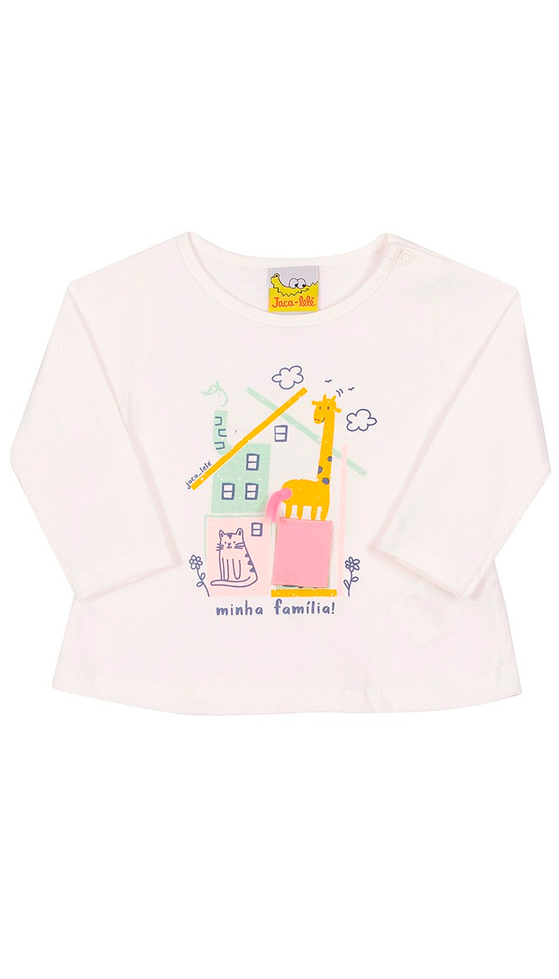 A blusa feminina Jaca Lelé possui gola redonda, manga longa e estampa frontal com aplicação.