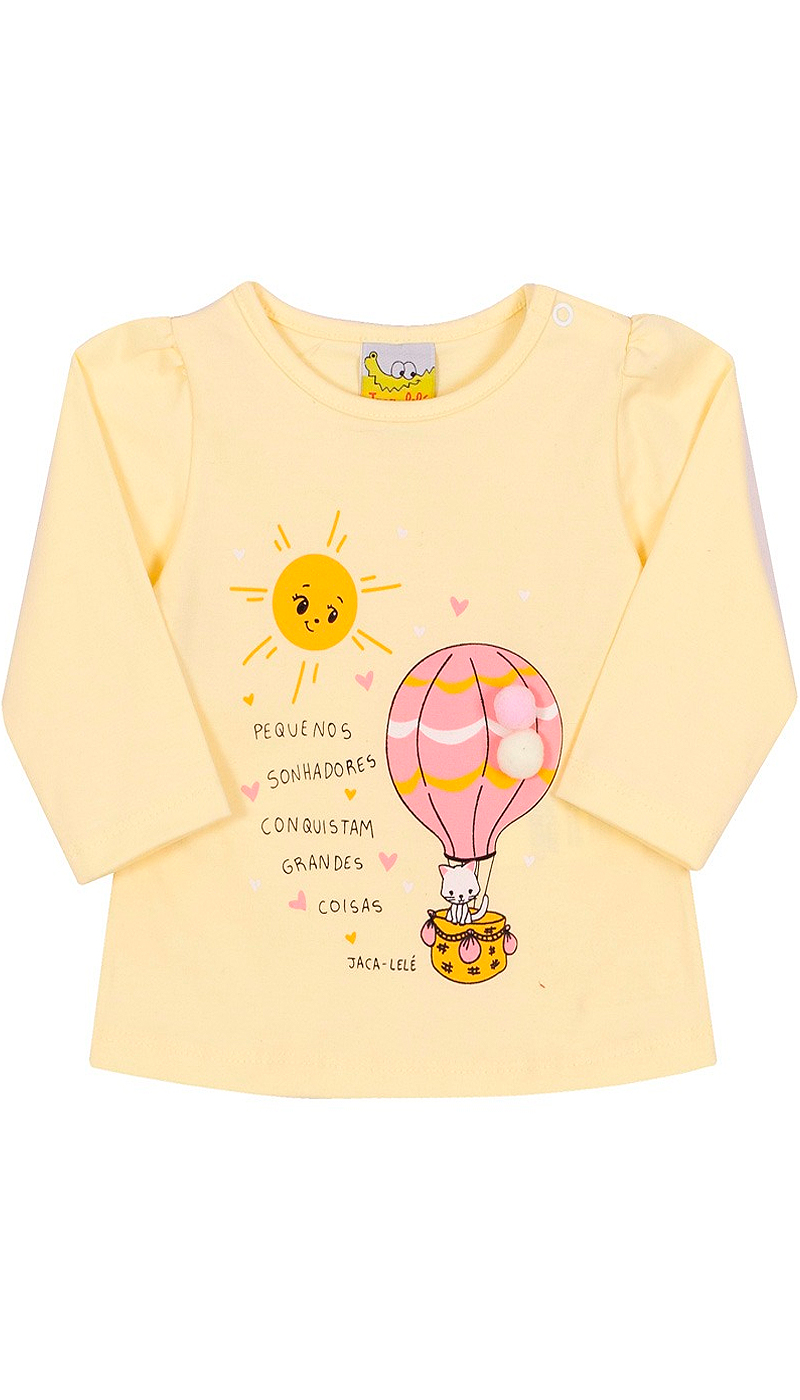 A blusa Jaca Lelé possui manga longa, gola redonda e estampa frontal