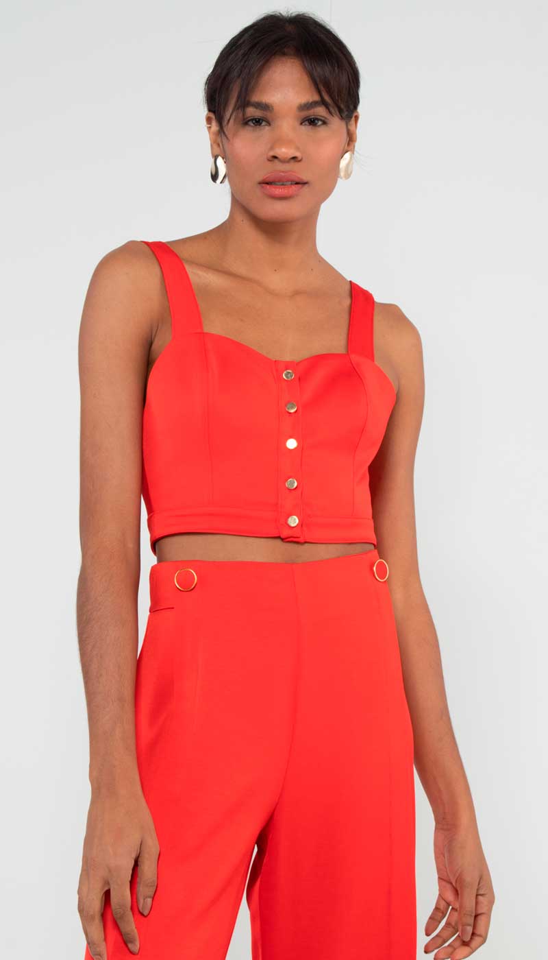 O top Dimy possui alças finas, detalhe de botões frontais, decote coração e tecido liso. Aposte!