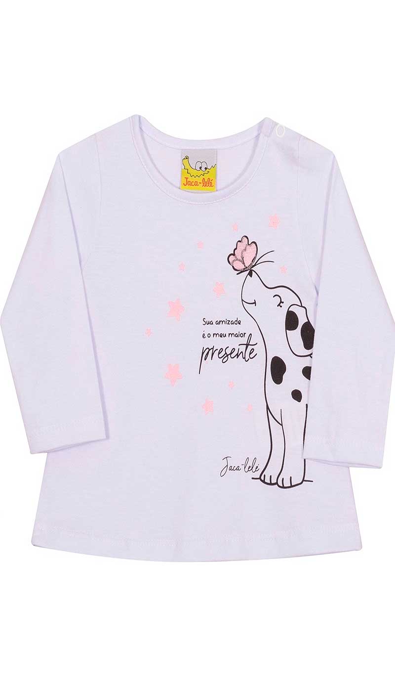 A blusa infantil feminina Jaca Lelé possui manga longa, gola redonda e estampa frontal com detalhe de aplicação