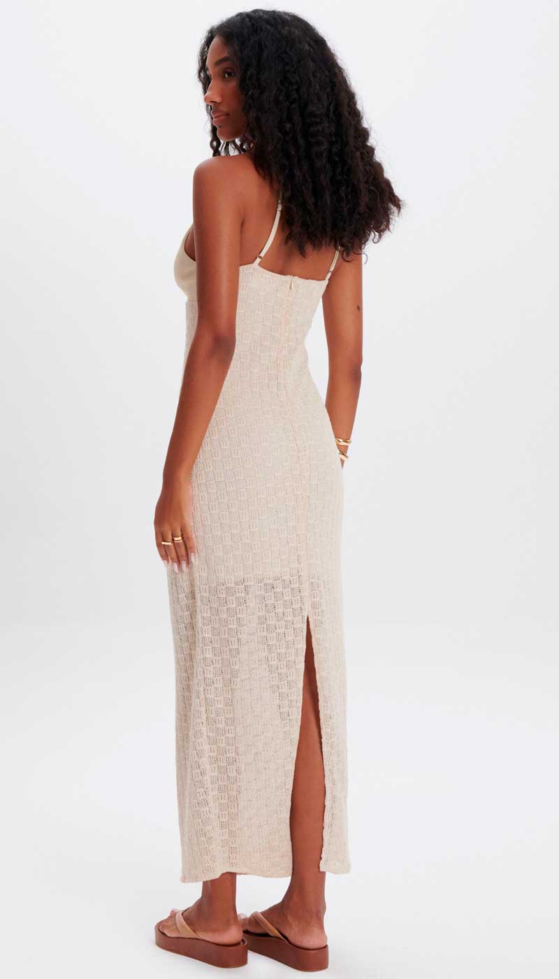 O vestido Myft possui decote v profundo, alças finas de regulagem, busto canelado, e saia em crochê. Aposte!