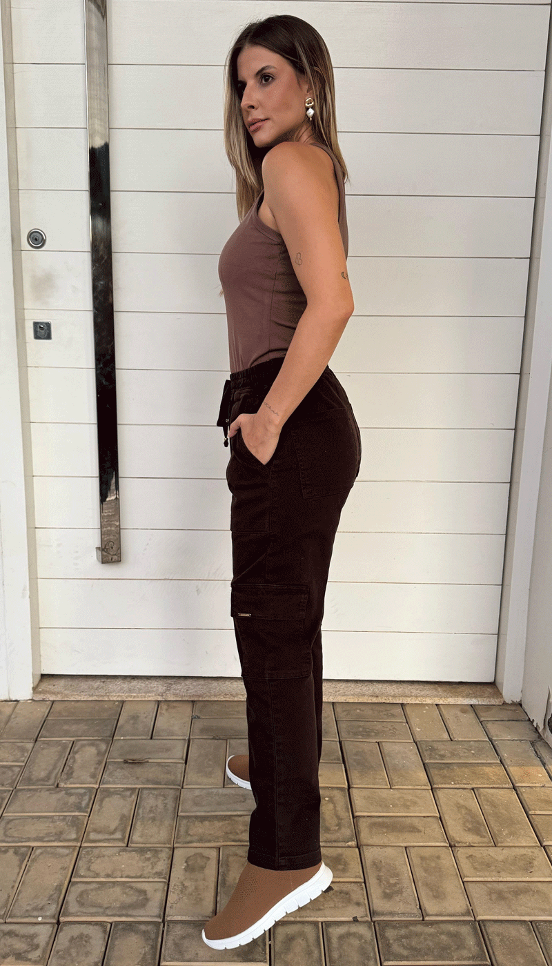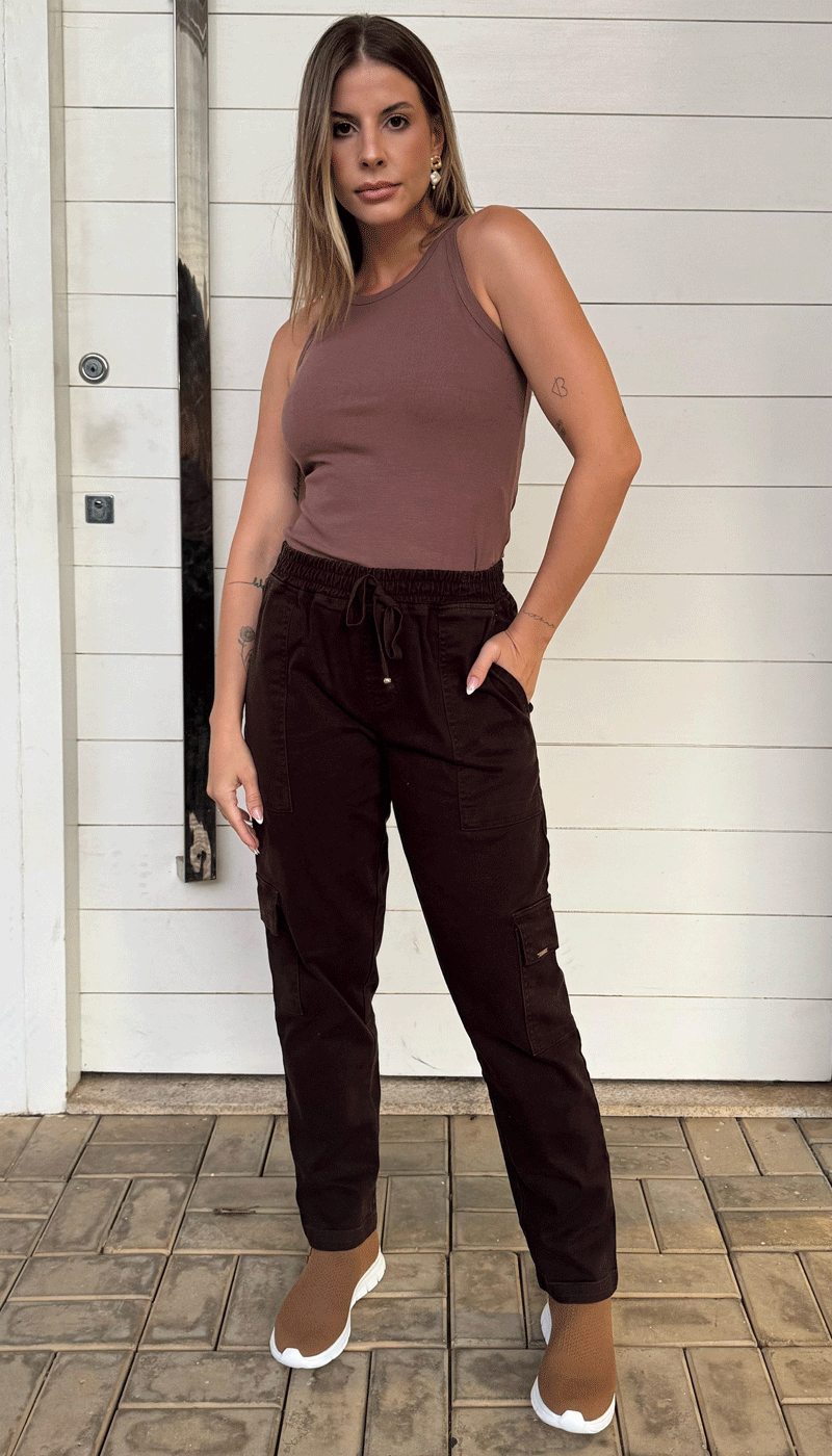 A calça feminina Ambicione foi confeccionada em tecido de sarja, possui cintura média, elástico no cós, bolsos e bolsos cargo. Aposte!