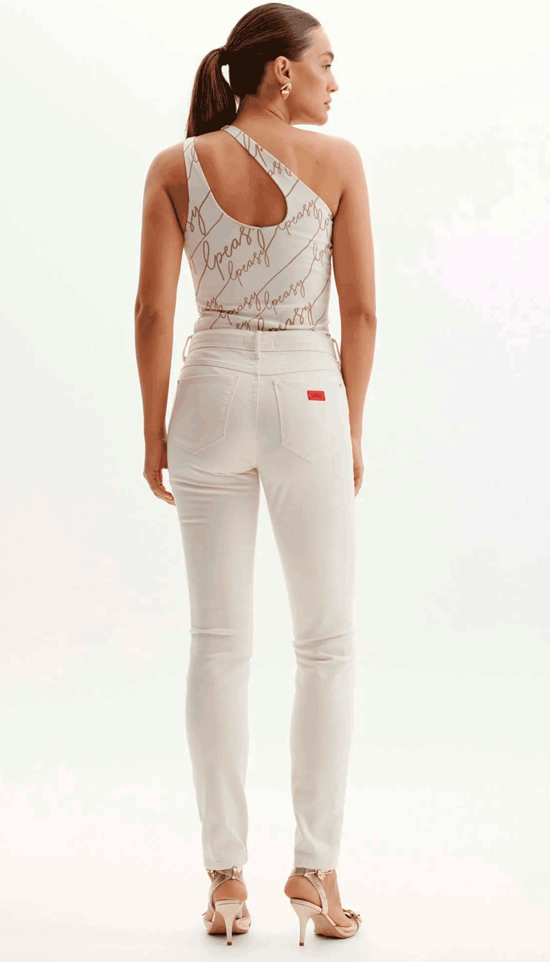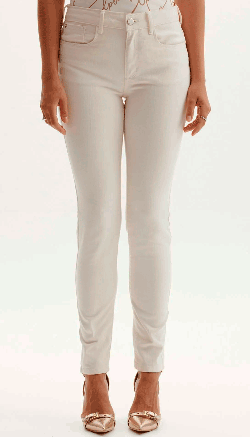 A calça off white feminina Lança Perfume possui modegaem skinny, foi confeccionda em tecido de sarja, possui cintura média e bolsos. Aposte!